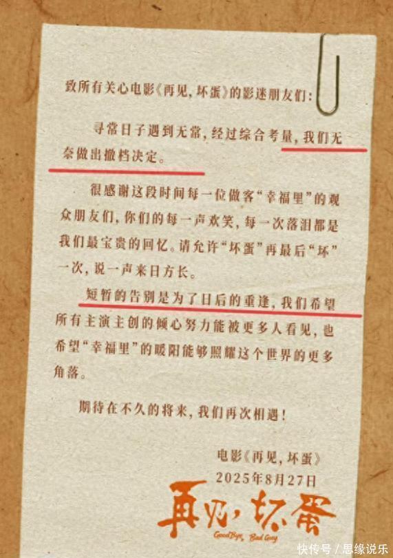东说念主设坍弛、因果报应?吴京新片官宣撤档,此次他的路东说念主缘“被作光” 最近有个事儿还挺让东说念主不测的,即是《再会,坏东西》这部电影,官宣撤档了!音讯一出来,许多网友齐挺情切的。你知说念不,这部电影从上映到撤档才六天时辰,这也太短了吧,许多东说念主齐麻烦,好好的电影咋就倏得撤档了呢? 其实原因也挺赫然的,即是票房太不睬思了,悉数才 26 万,这数据是真是差劲儿。有东说念主猜可能是题材受众小,不是那种热点题材。不外有真谛的是,吴京不仅在这部电影里客串,还是投资东说念主呢。按说有他在,本该是个流量密码,效果反倒起了副作用。