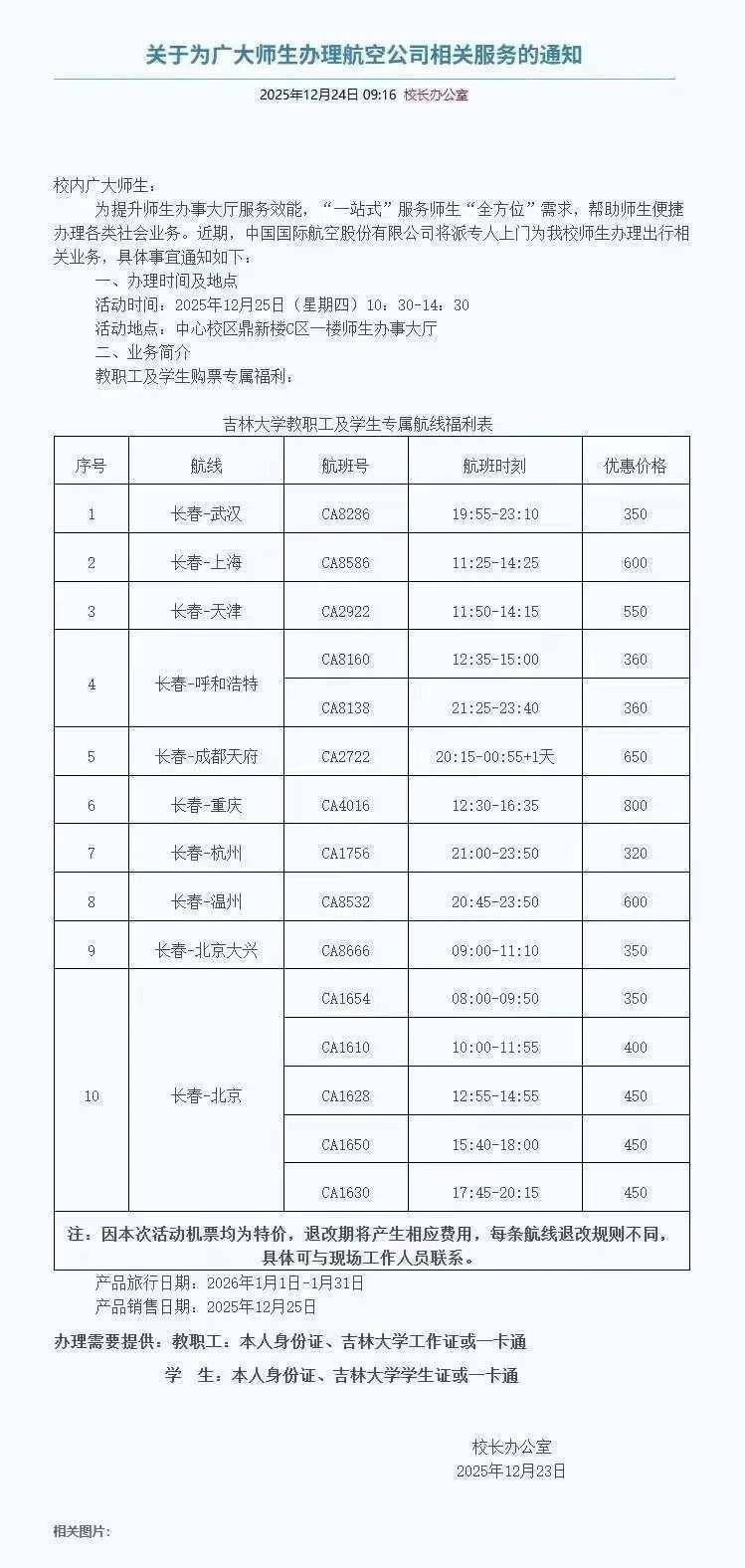 据网友发布的见知信息暴露,12月25日中国国外航空股份有限公司派专东谈主为吉林大学师生办理出行有关业务,活动时辰为10时30分至14时30分。吉林大学教员工及学生专属航路福利表内表明有航路、航班号、航班期间、优惠价钱信息,共有10条航路,包含武汉、上海、天津、成王人等热点城市,优惠价钱最低仅为350元。值得一提的是,居品旅行日历为2026年1月1日至1月31日。