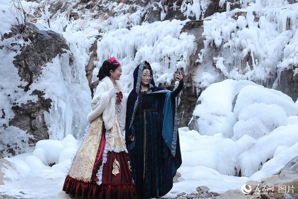 2026年1月22日,在河南焦作云台山景区,冰瀑景不雅眩惑搭客前来不雅赏留影,宛如步入童话世界。东谈主民网记者 霍亚平摄