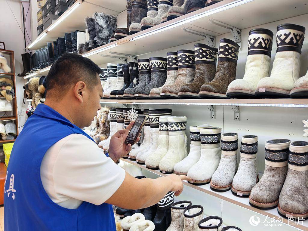 2025年12月22日,在内蒙古呼伦贝尔市的一家鞋店内,伙计正在线上匡助顾主选购马毛靴。东谈主民网记者 赵梦月摄