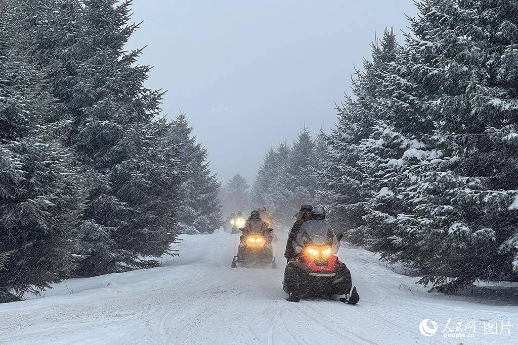 2026年12月23日,在吉林延边安图县雪岭景区,搭客乘坐雪地摩托驰骋在林海雪原。东谈主民网记者 李念念玥摄