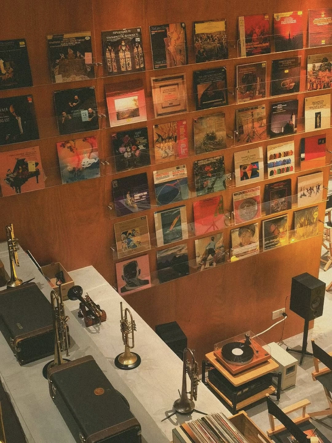 楼梯拐角放着一架钢琴,墙上挂满了杨捷储藏的黑胶唱片,柜子里排列着几把 vintage(旧式) 小号。每周总有那么几天,杨捷会带着学生在二楼的包间里上课。小号声从窗户飘出去,楼下喝咖啡的来宾偶尔会昂首看一眼。
