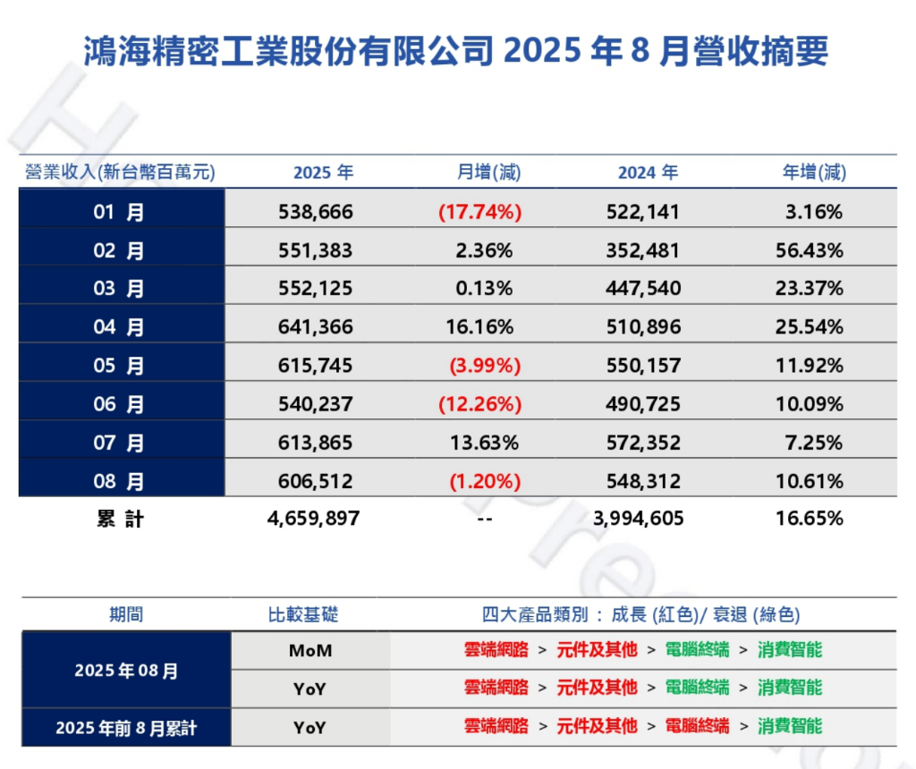 周五,鸿海公布的数据线路,8月营收总和为6065亿新台币(约合198亿好意思元),同比增长10.6%,为积年同期最高,环比略下跌1.20%。2025年前8月累计营收为4659.9亿新台币,同比增长16.65%。这一增长标明,阛阓对AI基础面貌的需求已经平安。