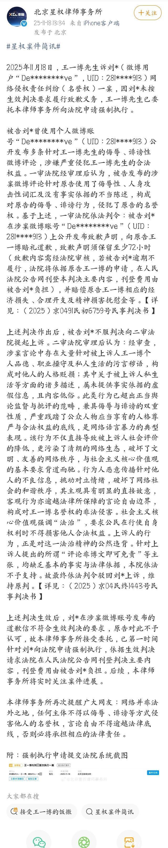 谈歉信依然发出,即激发了王一博粉丝的热烈抗议。承办此案的北京星权讼师事务所坐窝选择应答行动,并发布声明,指原告不悦谈歉成果,已提请诉求并得到了法院批复的强制实行。 这,乐华文娱杜华雇主,又当如何应答呢?