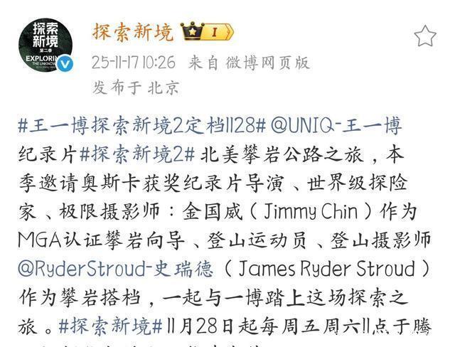十一月十八日下昼三点半,王一博的记载片《探索新境》第二季发布会如约而至。 《探索新境》第一季播出之后,全新的节目体式,真实诚实的探险经过,以及不仅探索新境,更是探索心情的充实实验,令节目充满惊喜,更是收货满满,夺得泰利奖金奖。