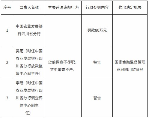 【大河财立方音讯】4月1日开云体育,中国农业发展银行四川省分行表露的行政束缚信息走漏,因贷前打听不尽责,贷中审查不严,中国农业发展银行四川省分行被罚金80万元。时任该行放款监督中心副主任吴雨、时任该行打听评估中心副主任李珊被警告。