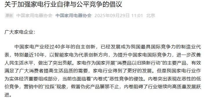 【大河财立方音讯】9月29日开yun体育网,中国度用电器协会发布《对于加强家电行业自律与平允竞争的倡议》。